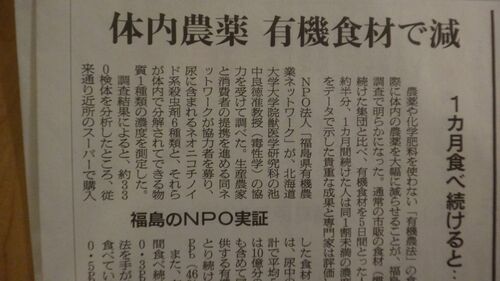 有機農法の食材を食べ続けると 体の中の農薬を大幅に減らせるそうです 先日の朝日新聞の夕刊に載っていました (7月29日第8面) 福島のNPO法人 「福島県有機農業ネットワーク」の調査で 五日間食べ続けると約半分、ひと月食べ続けると 1割未満まで 体内…