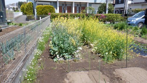 この菜の花の奥に レタスがあります こんなかんじです 四川搾菜の花は どう見ても食べられないので 引っこ抜いてしまいました 奥にあるのはブロッコリーやケール (余った苗を植えておいたものです) スナップエンドウは だいぶ育ってきて 一週間もすると 採…