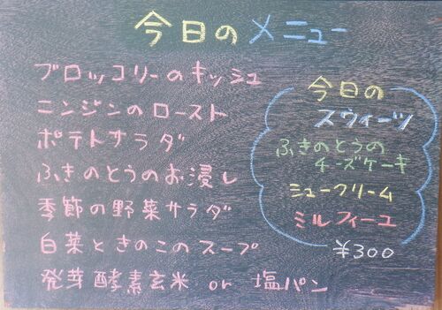 今週のメニューです ブロッコリーのキッシュ ニンジンのロースト ポテトサラダ ふきのとうのお浸し 季節の野菜サラダ で、ランチプレートです 今週のスウィーツは ふきのとうのチーズケーキと シュークリーム それと 先週もメニューにあったミルフィーユです…