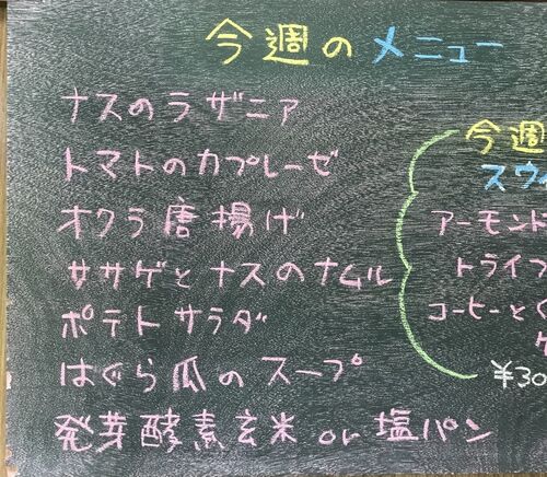 今週のメニューです ナスのラザニア トマトのカプレーゼ オクラ唐揚げ ポテトサラダ ランチプレートです もう一枚 どっちもボケていますけど、 まあ雰囲気はわかるかなということで。 今週のスウィーツのトライフルは 畑の冷凍イチゴを使っています 今日は …