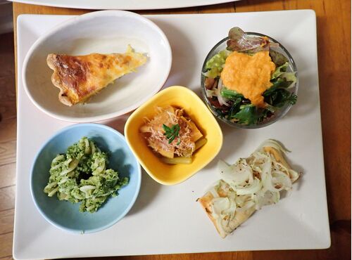 今週のメニューです ランチプレートと 菜の花いろいろ 上からのらぼう、ケール、白菜、黒キャベツ、小松菜です スープはミックス野菜 上に載っているのは粉末にしたセロリ スウィーツはカボチャのブラウニーと プリンケーキです 畑に行ったら あちこちに不思…