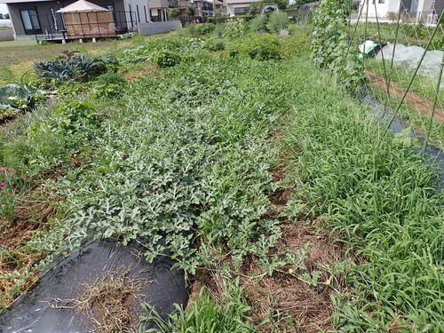 小玉スイカとまくわうりの畝です 雑草がすごいので、まずは西側を 除草し つぎに東側も 除草しました 小玉スイカが何個か大きくなりだしています まくわうりは まだ3㎝くらいですが 早めにカラスよけの糸を張っておいた方がいいかもしれません 北側のかぼち…