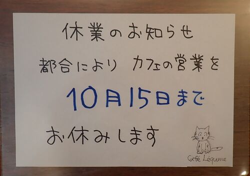 カフェレギュームの営業は 9月30日から10月15日までお休みします