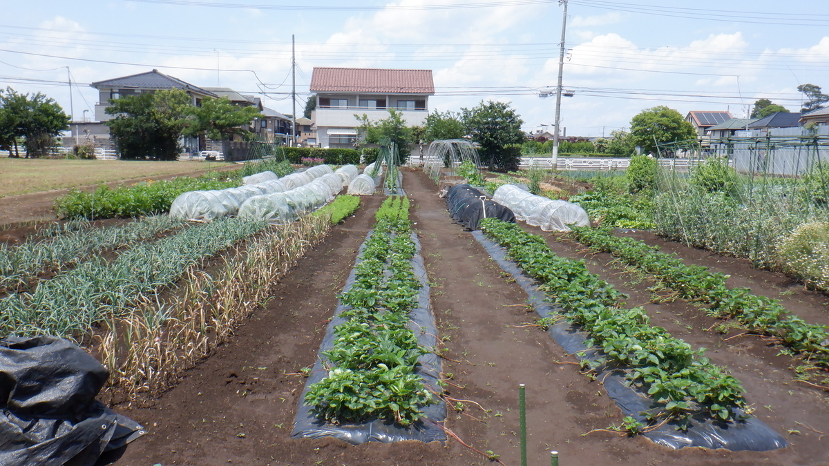 スイカやメロンの畝、その隣のかぼちゃやインゲンの畝です