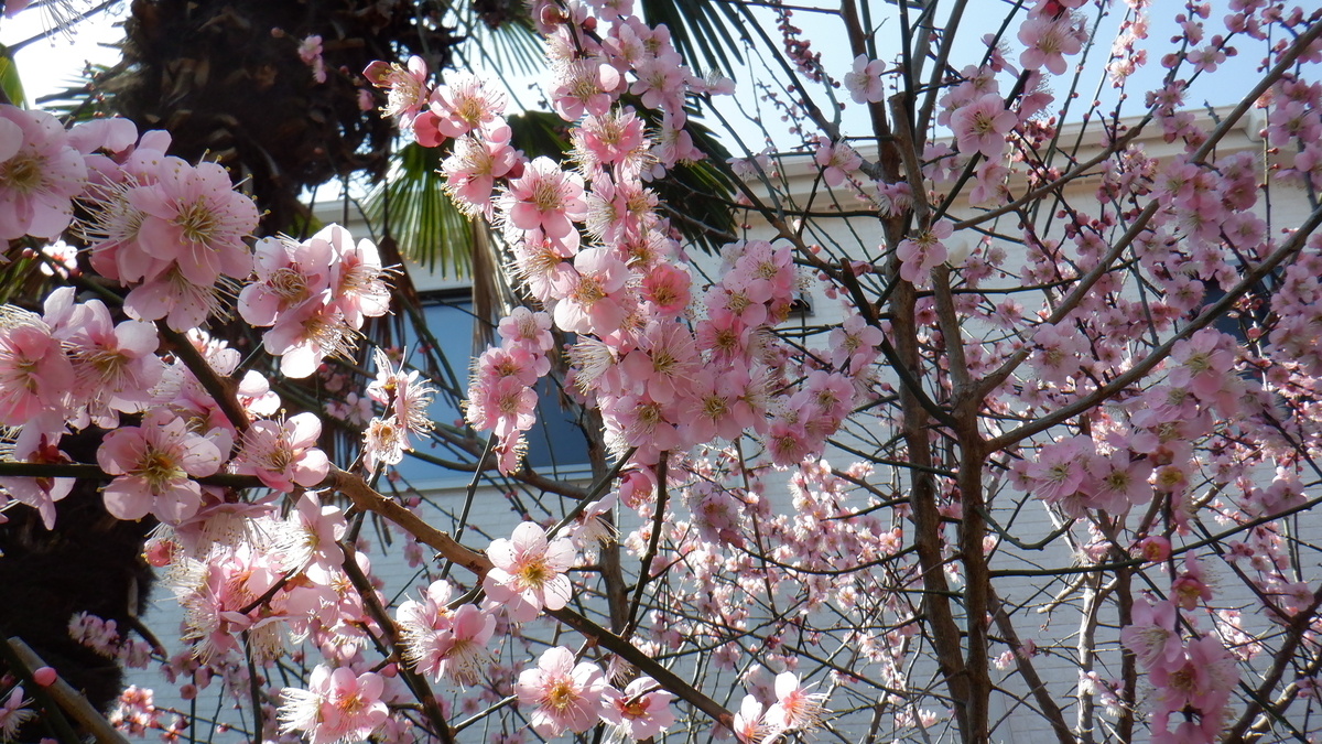 カフェの庭の奥にあるピンクの梅が満開です。