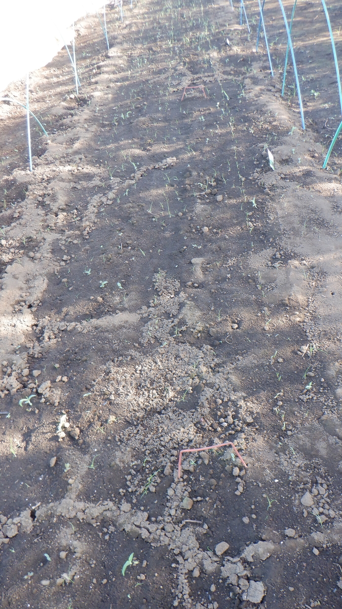 やっと芽が出てきたにんじんも、強い風で こすれています。