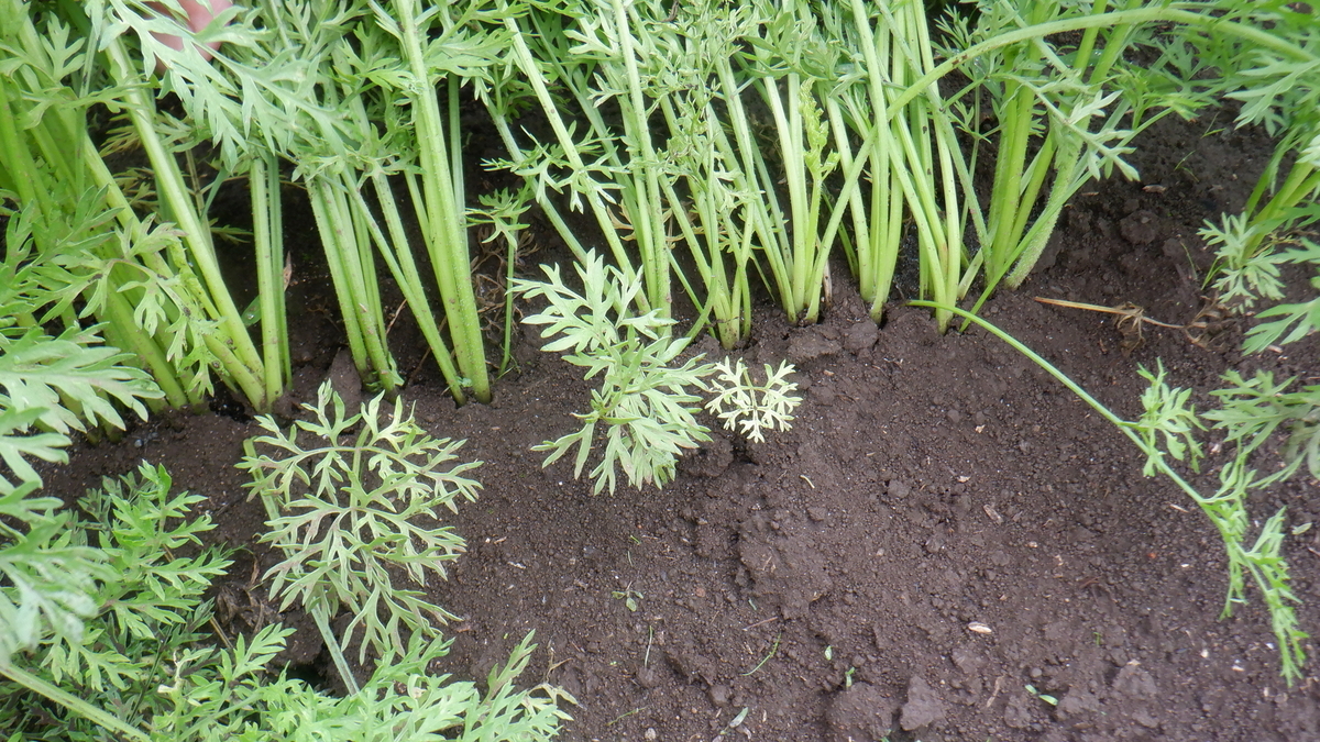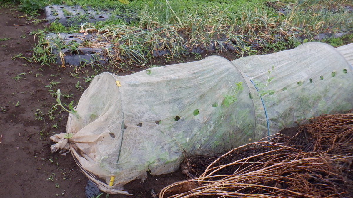 このスイカの向こうの倒れているタマネギを少し収穫し、
