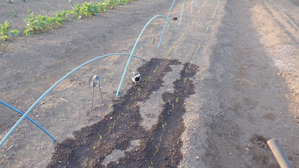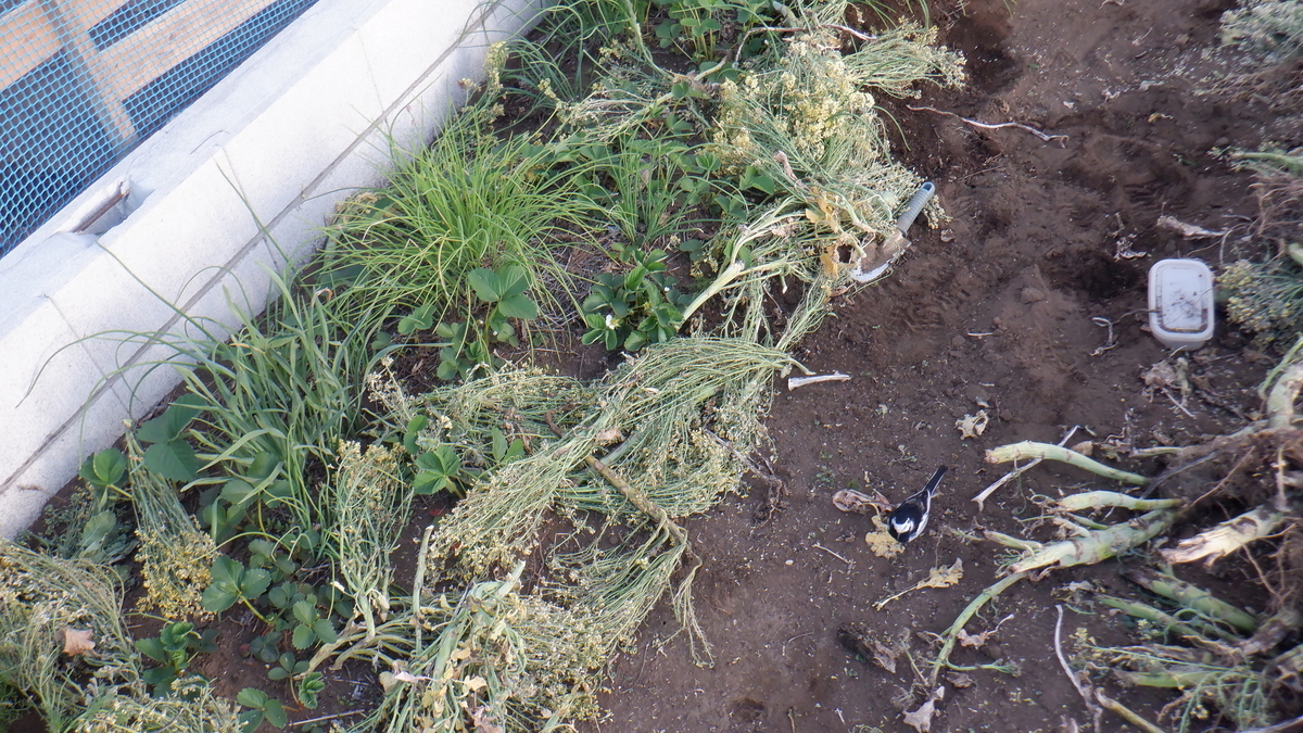 東側のイチゴを 除草しながら鳥よけの枝を置き