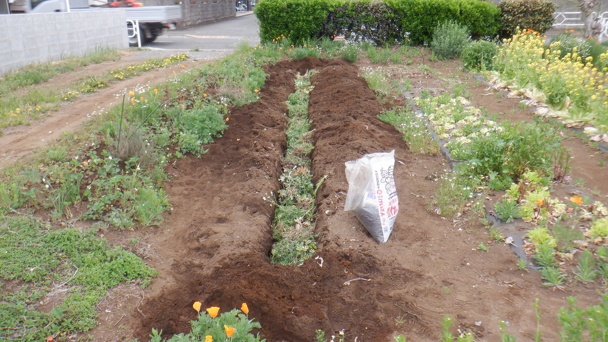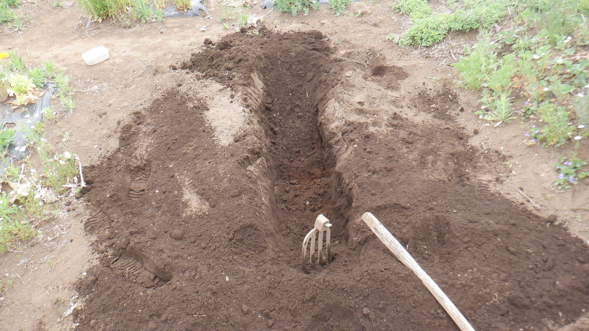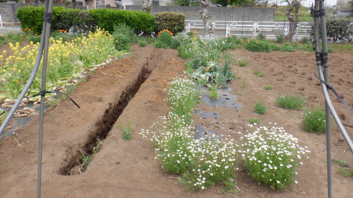 野菜の残渣や鶏糞を入れて埋め戻しました